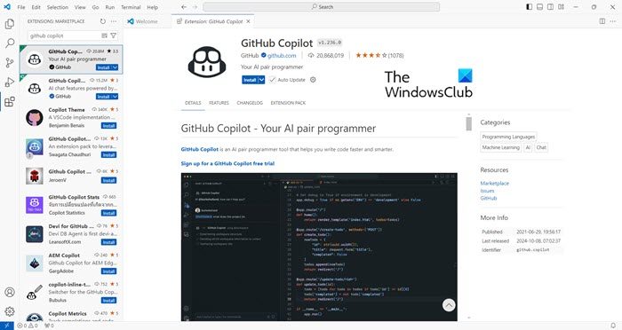 接下来,我们有GitHub Copilot 扩展,一个人工智能驱动的实用程序,可以通过提供建议和完成代码来帮助您。借助 OpenAI 模型,Copilot 可以帮助您更快、更高效地编码。它可以根据您当前工作的上下文建议整行或代码块。该工具可以生成代码片段,将注释转换为代码,并帮助您学习新的语言和框架。