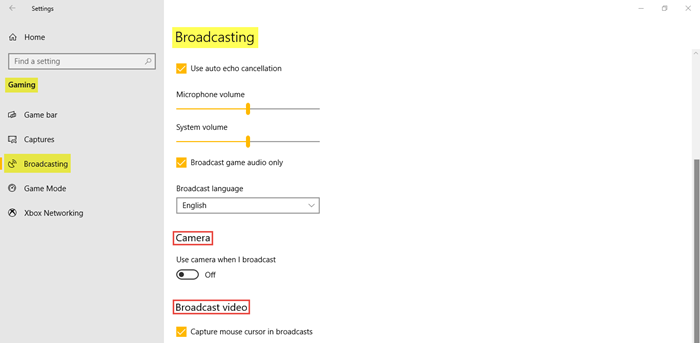 如图所示,如果您希望在广播时打开麦克风、使用自动回声消除以及仅广播游戏音频,则可以单击复选框。 调整麦克风音量和系统体积如所须。 另外,选择广播语言从下拉菜单中。 此外,您可以选择在广播时打开摄像头并捕获广播中的鼠标光标。