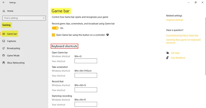 当您在 Windows 10 PC 上打开游戏设置时,您将在左侧窗格中看到五个类别: