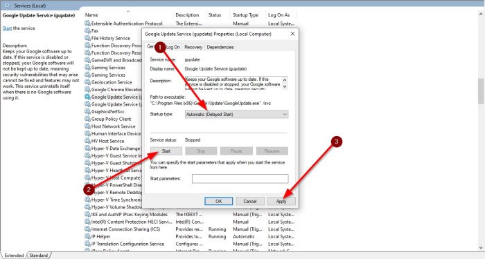 您应该检查Google Update Services(古普特和Gupdatem)被禁用。这些服务有助于自动更新Chrome浏览器。如果他们服务状态设置为停了下来和启动类型是禁用,您可能会在尝试更新Chrome浏览器时会收到错误。