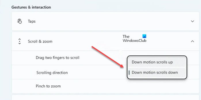 - 单击下拉菜单并选择所需的设置。 对于相同方向滚动,选择向下运动向下滚动。或者选择另一个以获得相反的结果。