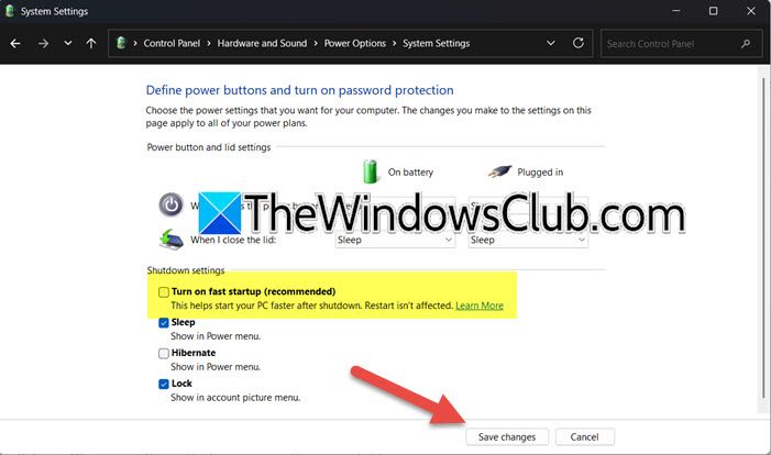 - 解开“打开快速启动”然后单击“保存更改”。